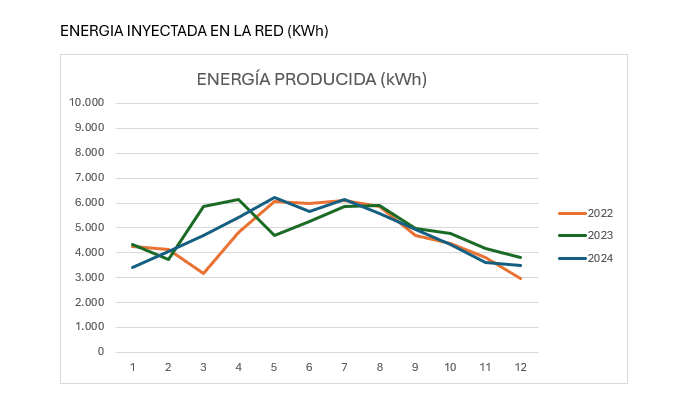 Durante este año, la planta ha generado un total de 57.571 kWh de energía eléctrica. Este valor representa una disminución del 3,31% respecto a la producción registrada en 2023 (59.540 kWh), rompiendo así la tendencia de crecimiento observada en los dos años anteriores. No obstante, la producción de 2024 se mantiene en niveles similares a los de 2022 (56.227 kWh), lo que demuestra un rendimiento sostenido dentro de los márgenes esperados para este tipo de instalación.